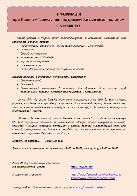 • 0 800 500 313 – Гаряча лінія підтримки батьків після пологів